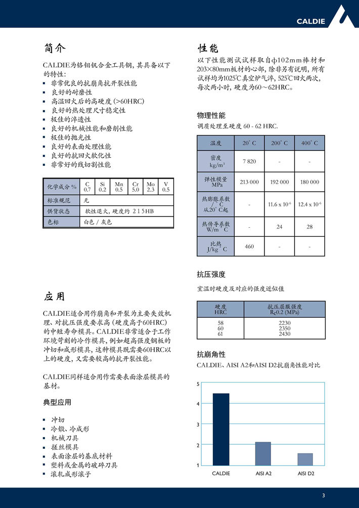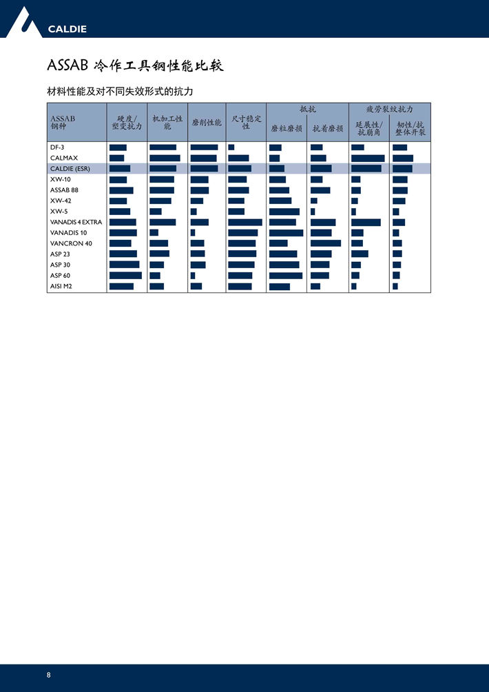 瑞典***CALDIE模具鋼:高合金工具鋼,適用于以崩角和開裂為主要失效機(jī)理,而需要一個高的抗壓強(qiáng)度(硬度超過HRC60)的中低壽命模具。...